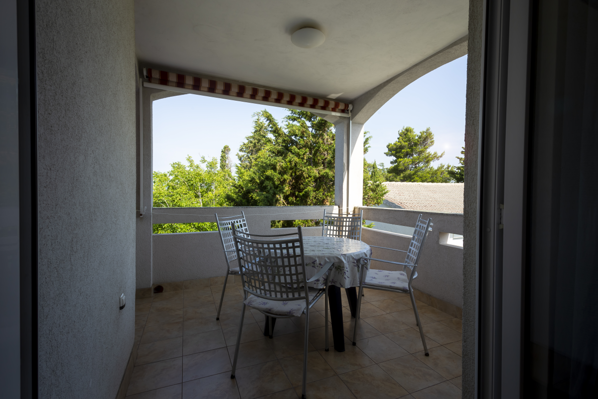 The balcony is equipped with a table and chairs, a clothes dryer and an awning, and the view is towards the west - the sea and the sunset.