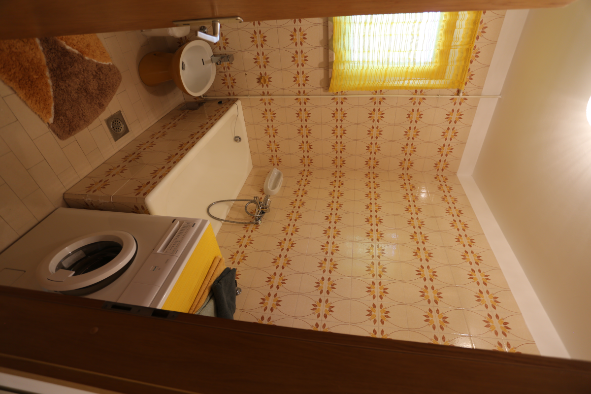 the apartment is located in a side street surrounded by greenery