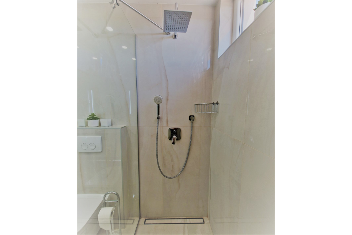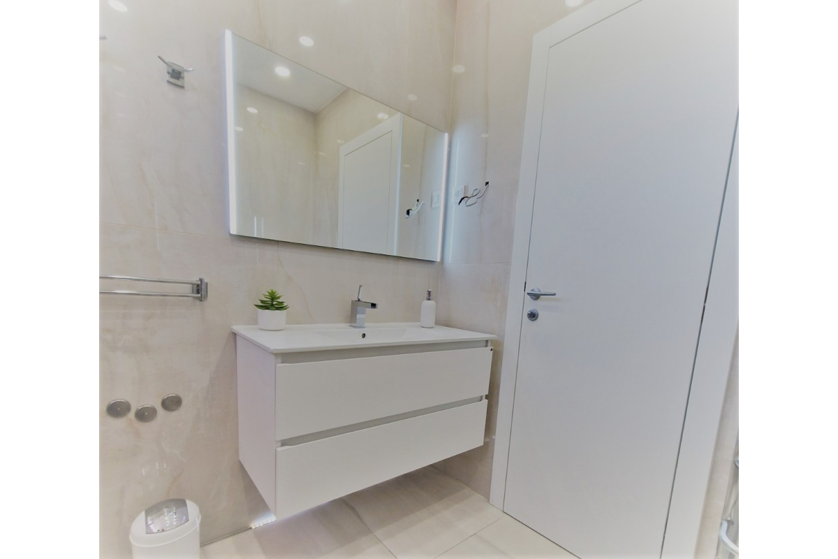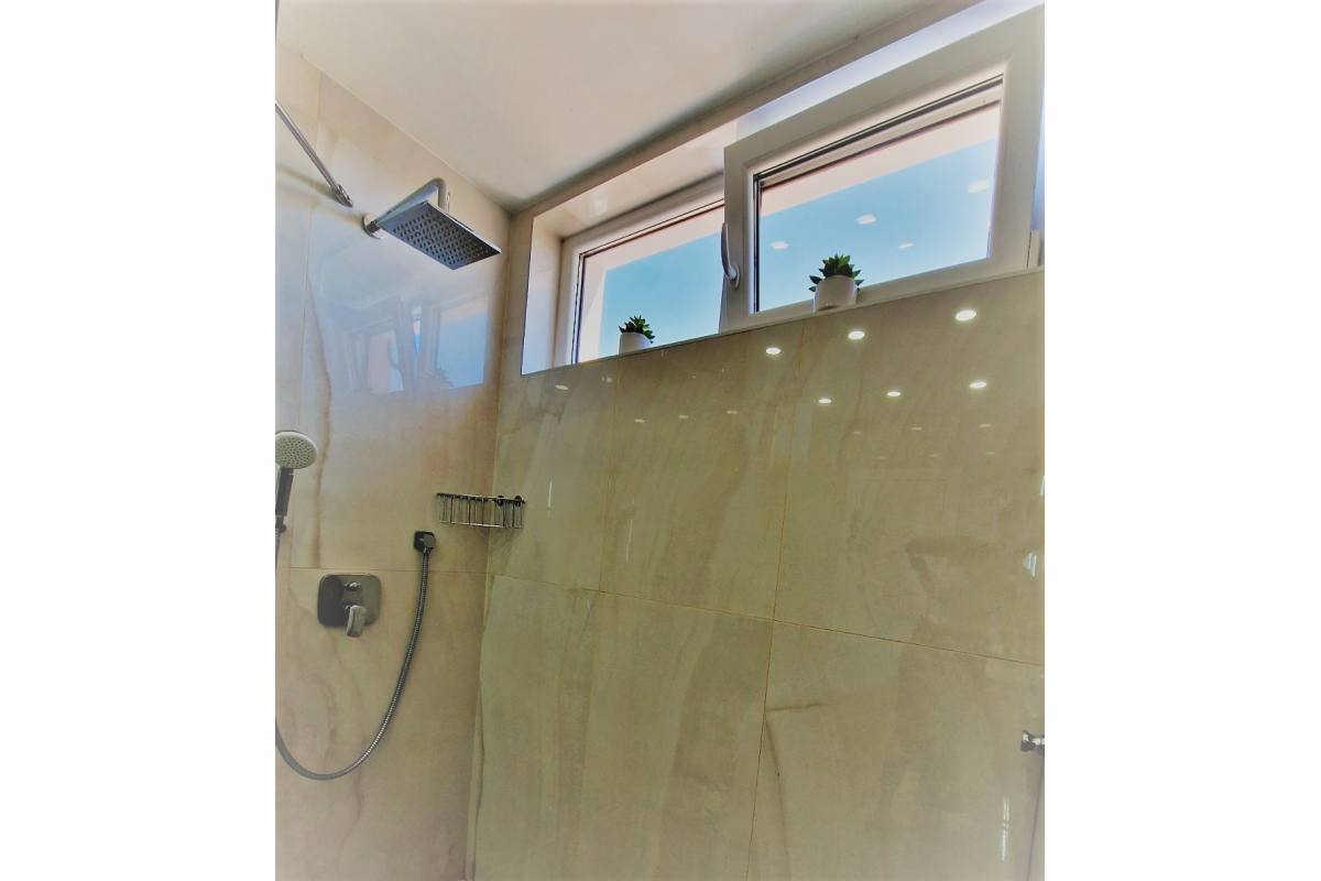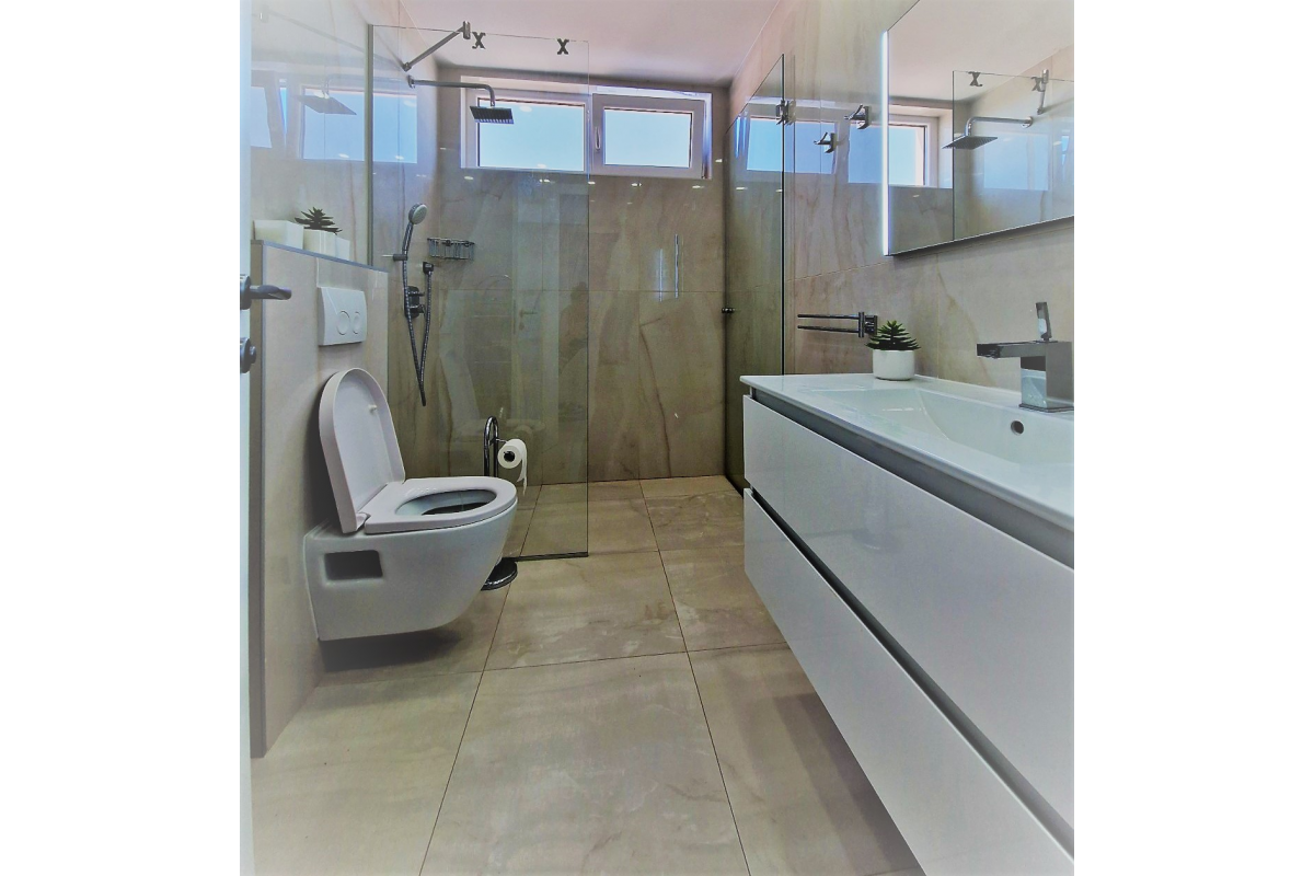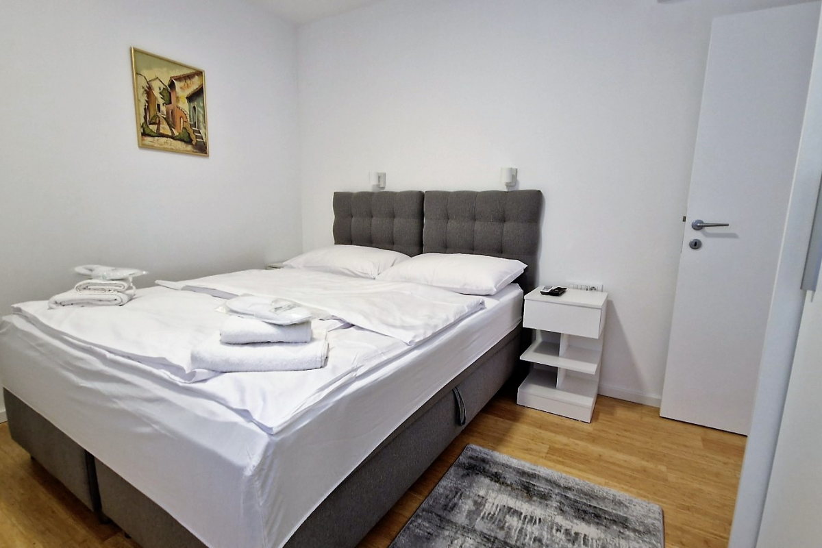 This calm air-conditioned apartment contains 2 bedrooms with king-sized beds and TV, living room with couch, coffee table and flat screen TV. Dining area is connected with living room as well as with kitchen. Kitchen includes its own dishwasher and microwave. Within the apartment it is also possible to relax on the terrace. Towels and bed linen are available in apartment.