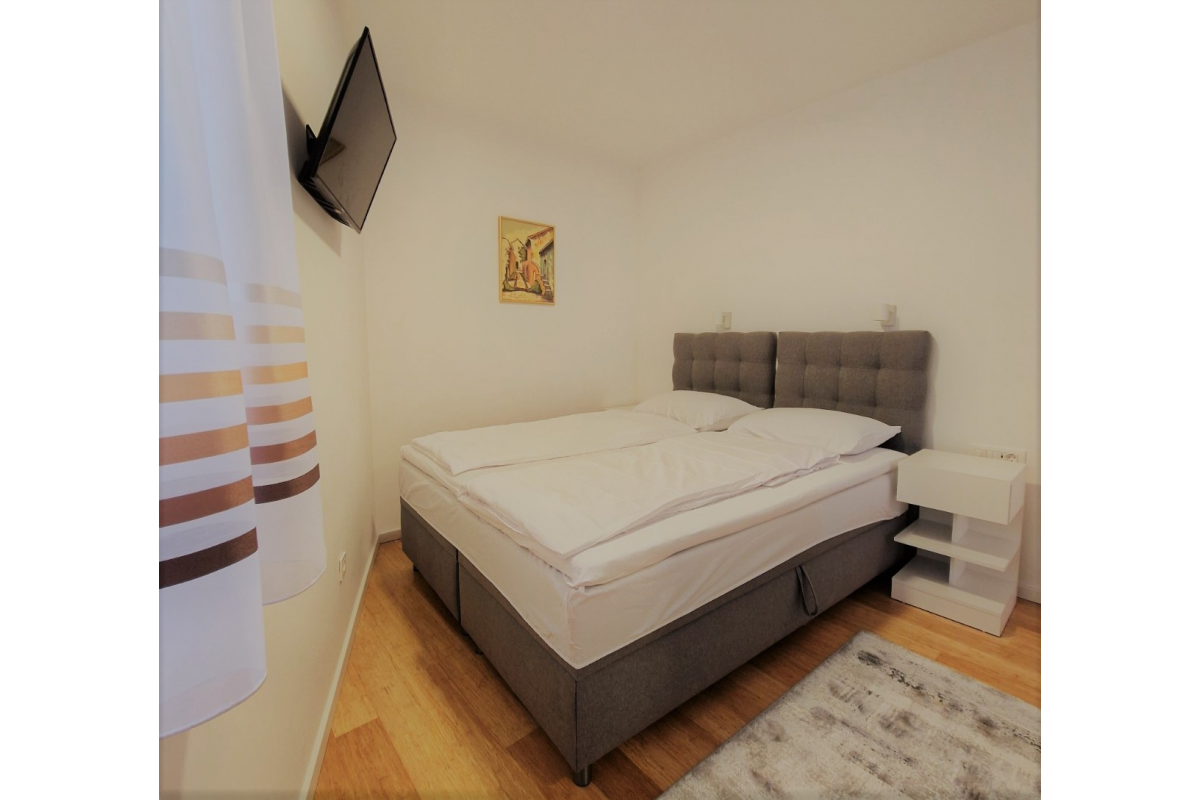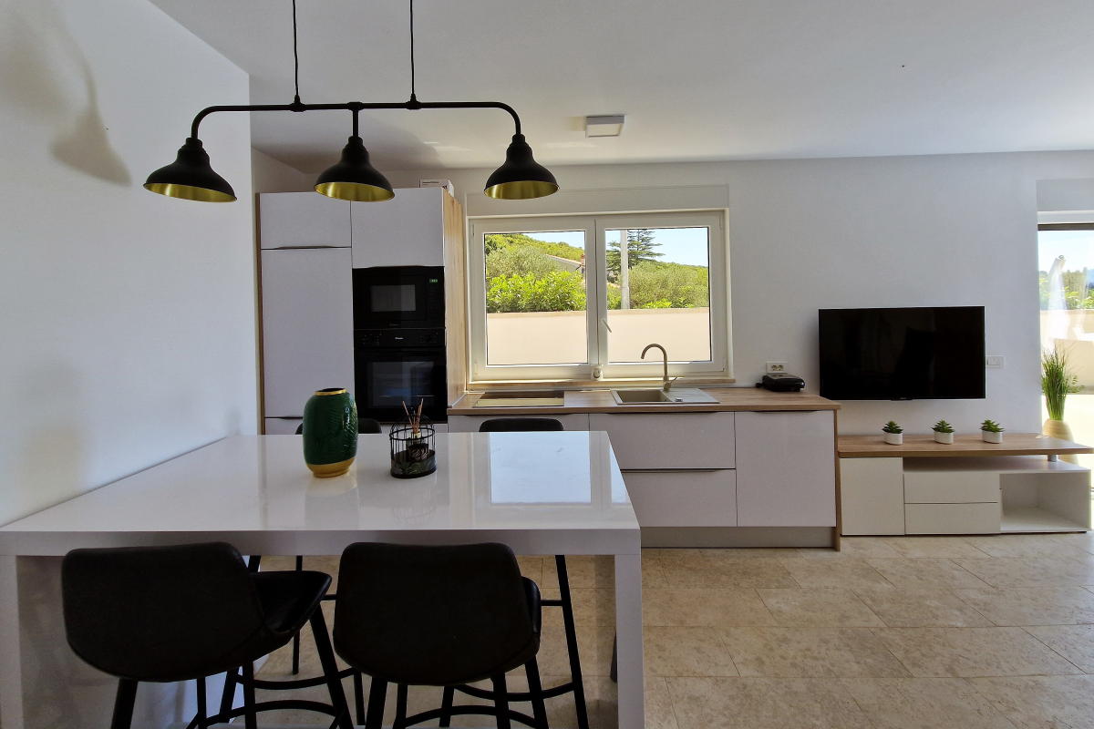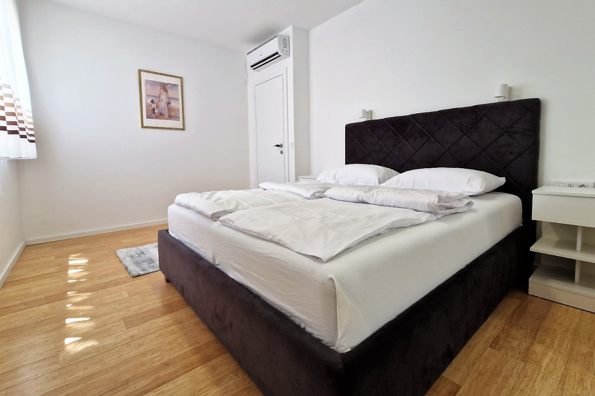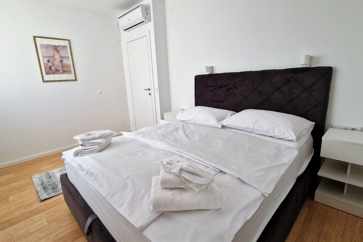 Mirni klimatizirani apartman sadrži dvije spavaće sobe s king-size krevetima i TV-om, dnevni boravak s kaučem, stolićem i TV-om ravnog ekrana. Blagovaonica je povezana s dnevnim boravkom kao i s kuhinjom. Kuhinja uključuje vlastitu perilicu posuđa i mikrovalnu pećnicu. U sklopu apartmana moguće je i opuštanje na terasi. U apartmanu su dostupni posteljina i ručnici.