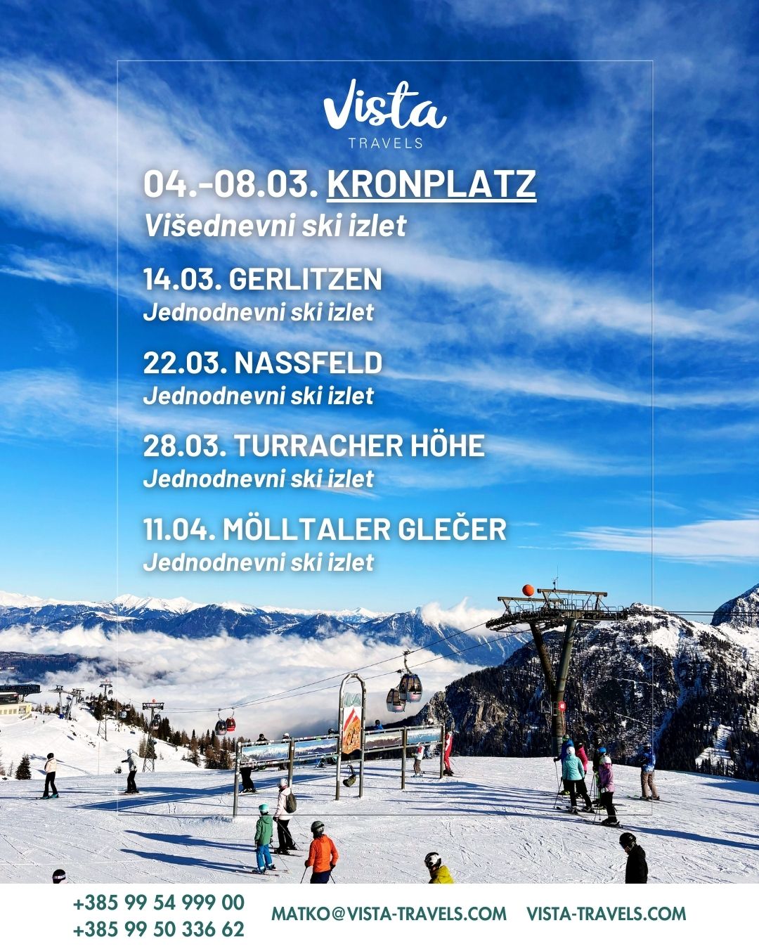 Krenite na nezaboravne jednodnevne vikend izlete na skijanje s Vista Travels! Posebno za one koji traže jednodnevno skijanje iz Rijeke, nudimo idealnu priliku za bijeg u snježne radosti. Vodimo Vas na prekrasna skijališta - Kronplatz, Gerlitzen, Nassfeld, Turracher Höhe i Molltaler.